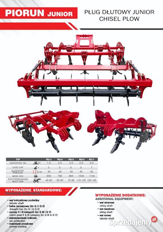 Pług dłutowy przeznaczony JUNIOR jest do uprawiania i przygotowania ziemi bezpośrednio pod siew, bez względu na to, czy jest to ściernisko po uprawie zbóż, kukurydzy czy też po uprawach okopowych. Wyposażenie standardowe malowanie proszkowe wał kolczatkowy podwójny wzmocnienia konstrukcji zaczep II i III kategorii zabezpieczenie kołkowe Wyposażenie dodatkowe wał strunowy wał daszkowy wał rurowy wał crosskill Parametry techniczne Szerokość robocza (CM) 250 Ilość łap 5 Głębokość robocza (CM) 45 Masa (KG) 950 Zapotrzebowanie mocy (KM) 70-90 * dostępne różne wersje *Posiadamy Różnorodne Maszyny Rolnicze ! *Zadzwoń ! Doradzimy ! Dobierzemy ! Gwarancja ! *Oferujemy transport na terenie kraju ! * Fak-Vat * Możliwość zakupu na raty W razie pytań proszę o kontakt : 730 016 677