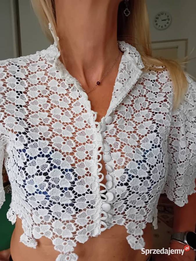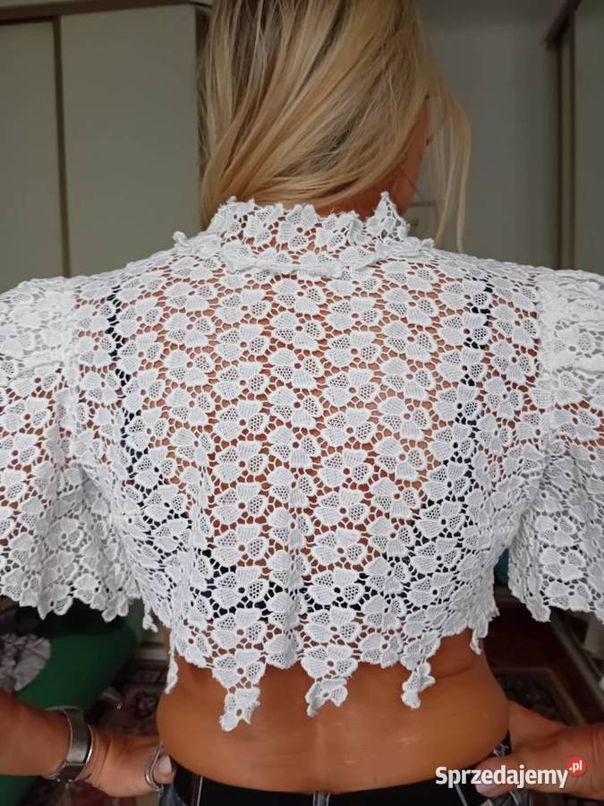 bolerko z białej bawełnianej gipiury, zapinane na satynowe guziczki robione na zamówienie. W plecach na płask 37cm , długość tyłu bez stójki około 30cm . Rękawki wszyte na małym usztywnieniu , typ bufka , efektownie rozszerzone. Stan idealny , po praniu , bez rozdarć i plam. Rozmiar S jeżeli lużno lub rozmmiar M jeżeli bardziej dopasowane.
