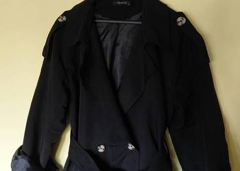 …Płaszcz czarny z szerokimi rekawami, wiązany w pasie. Na rękawach są ślówki na pasek lub wstążki ktorych brak i na lewym rekawie jest dziurka. Firma Trendyol, rozmiar 38…