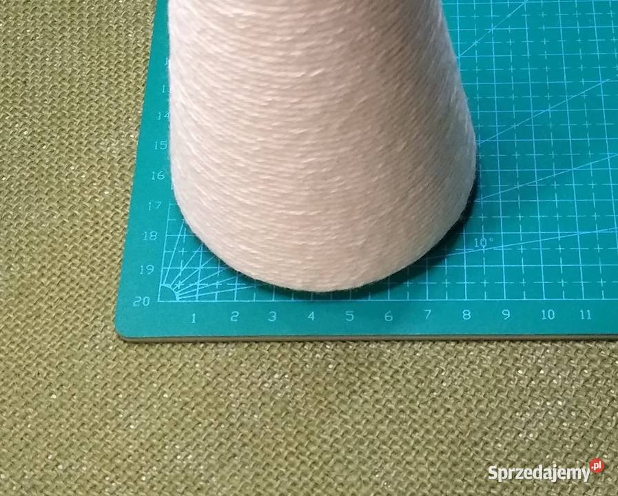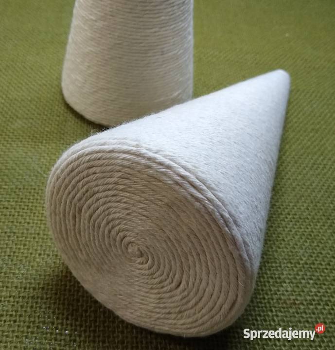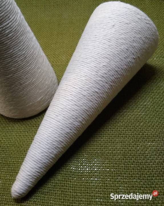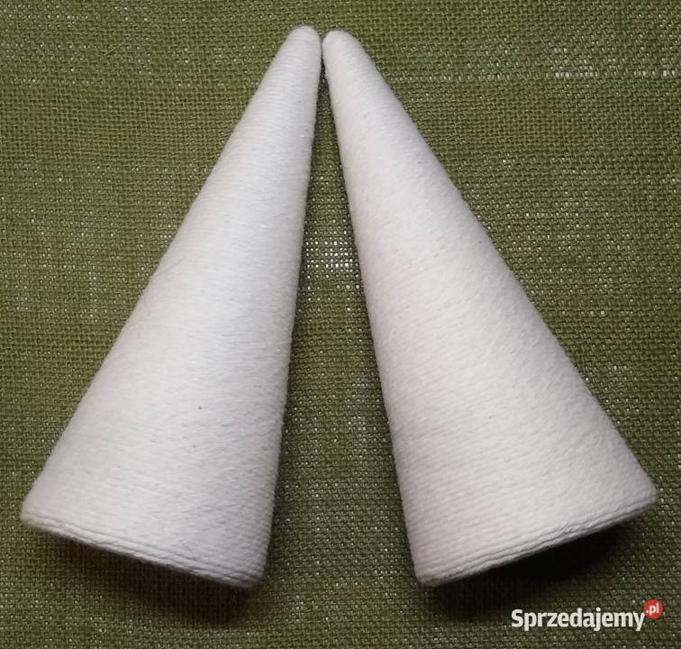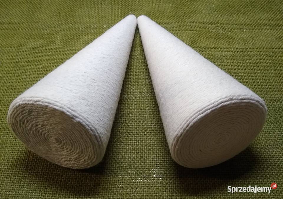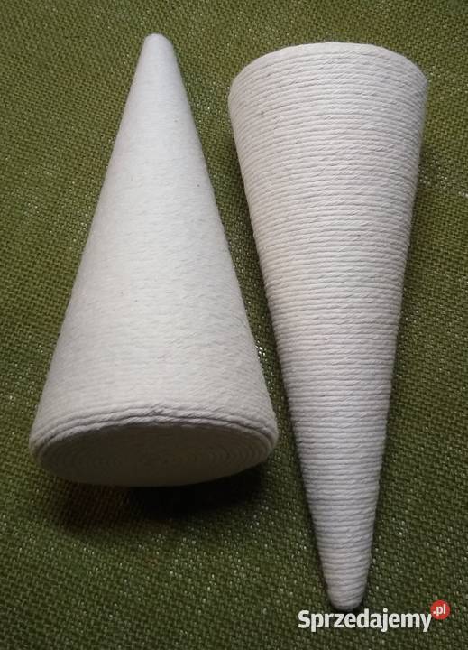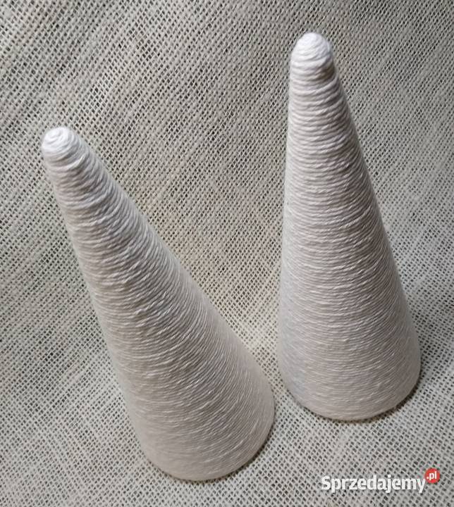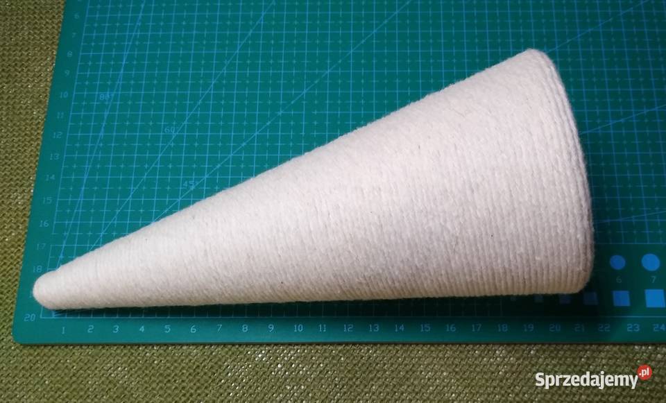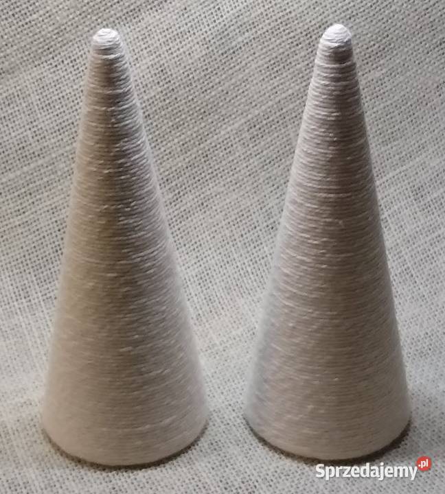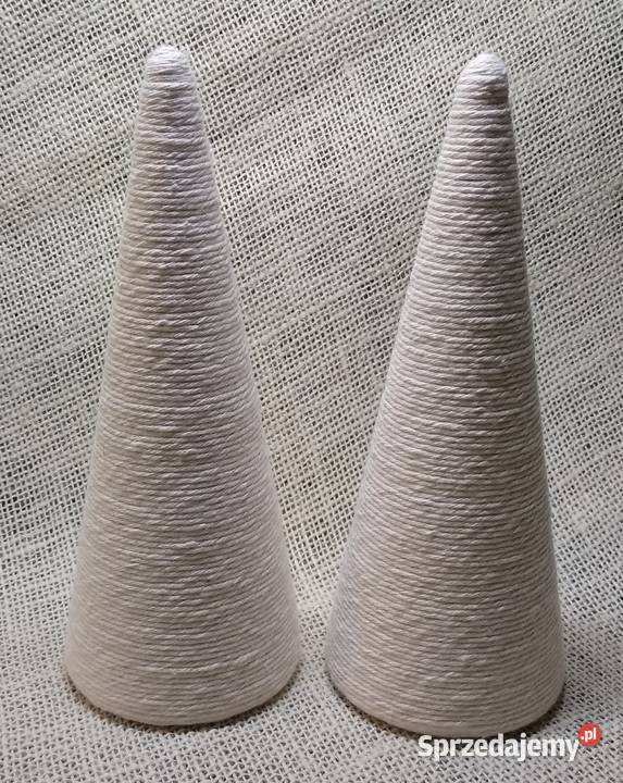 Stożek styropianowy starannie oklejony sznurkiem bawełnianym w kolorze ecru